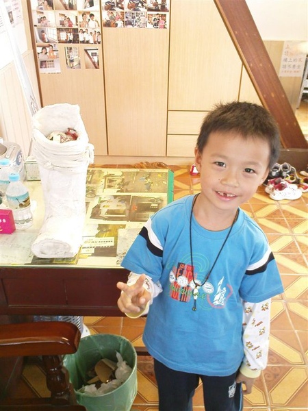 阿週很開心的跟茂伯的石膏腳拍照,(小噁)