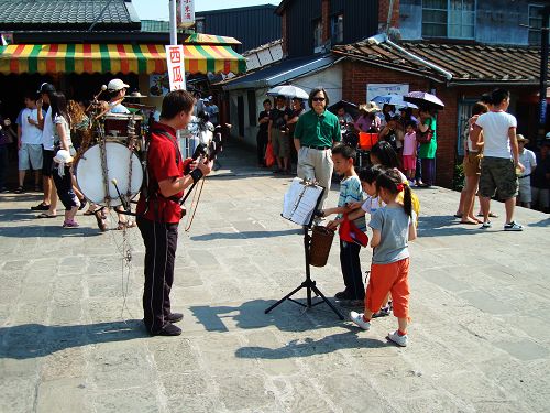 口渴了,我們在大廟邊喝仙草茶,
