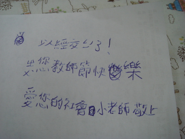 不過這一句「愛您的社會小老師敬上」真的是夠甜了,我教兩個班的社會,很巧的,擔任小老師的都是男生,