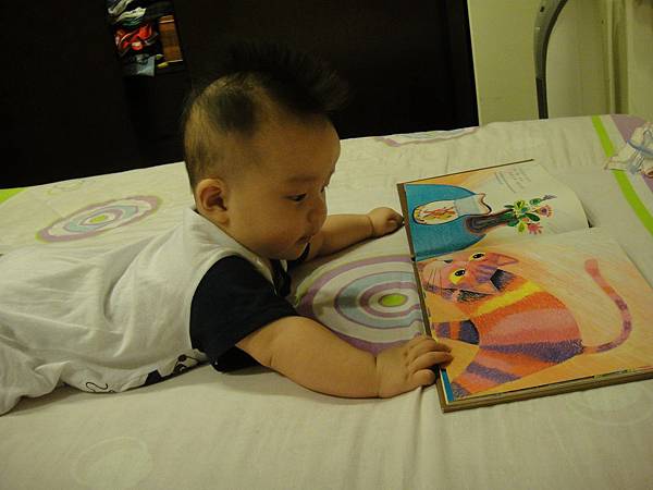 為了吸引他趴久一點,在他眼前放了「大花貓」的繪本,
