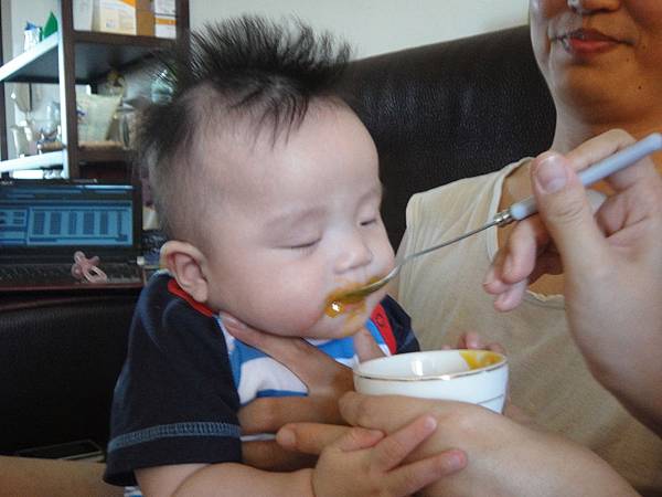 厲害的是,雖然睡著了,他的小嘴碰到湯匙還是會張開,